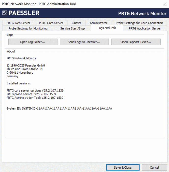 The About section shows information about the version of installed PRTG programs, copyright information, and your system ID.